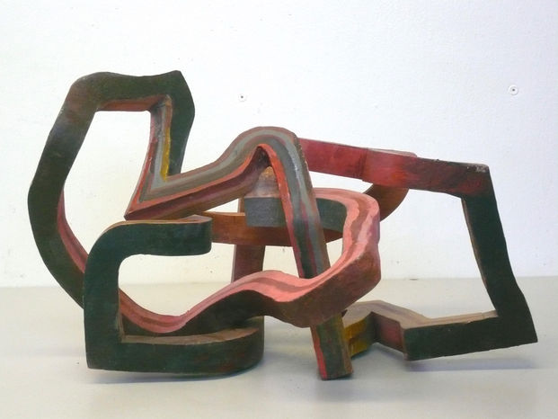 Prokofiev gradually switched his attention to free standing sculpture using much more bulky wood, coloured with wood dyes or bright paint. New forms developed and many of the new works were formally more integrated but also drawing attention to the possibility of each piece being made of parts by a polychrome approach to the colouration. In 1994 a second, rather different, ‘ship’ series was completed. From the very first listed sculpture in 1979 (OP 1) Prokofiev had assigned opus numbers to his sculptures quite separate from the cataloguing of his painting . The last sculpture to which he wished to designate an opus number was OP 752 (1994) and this therefore is his final registered sculpture. Over 15 years he therefore produced 752 pieces.